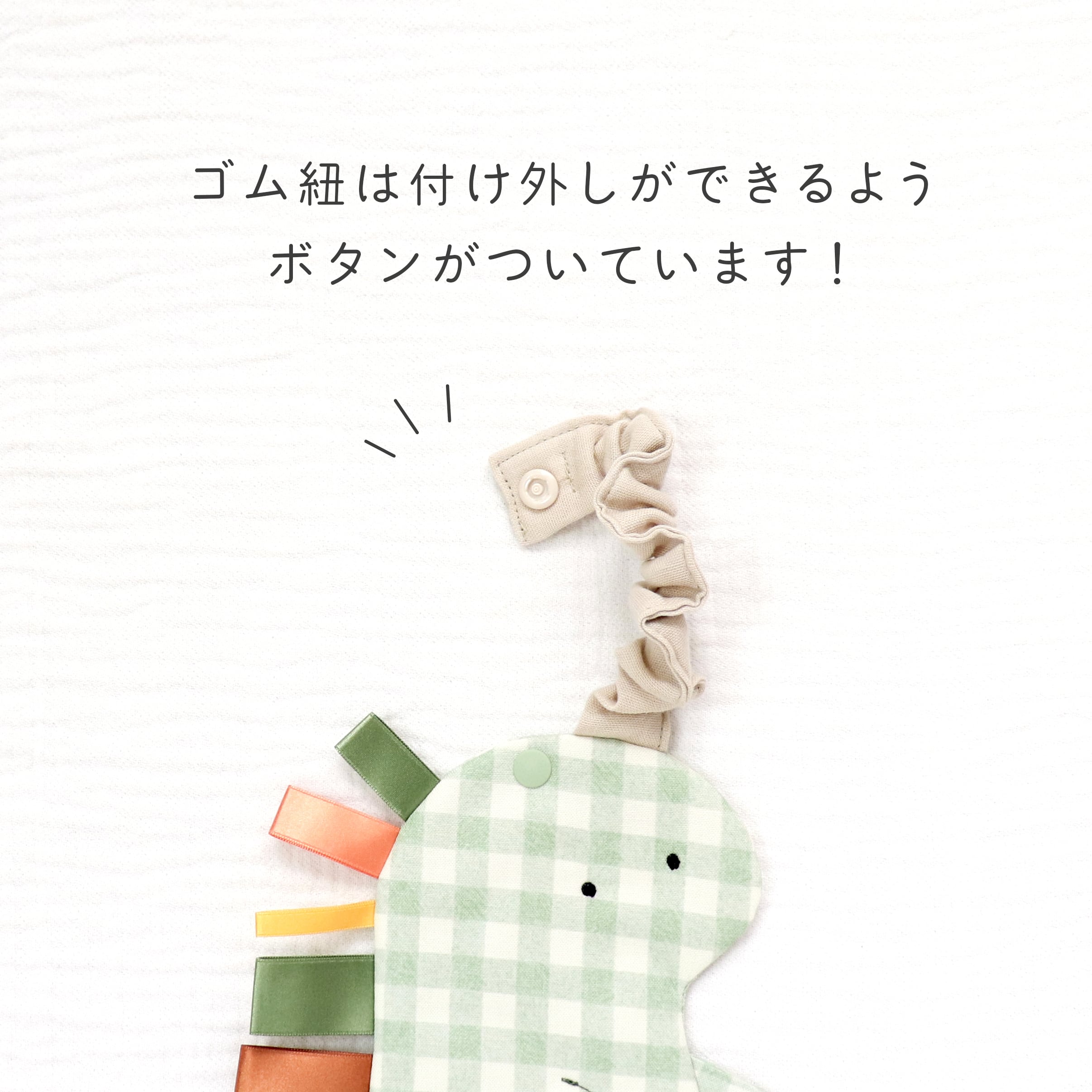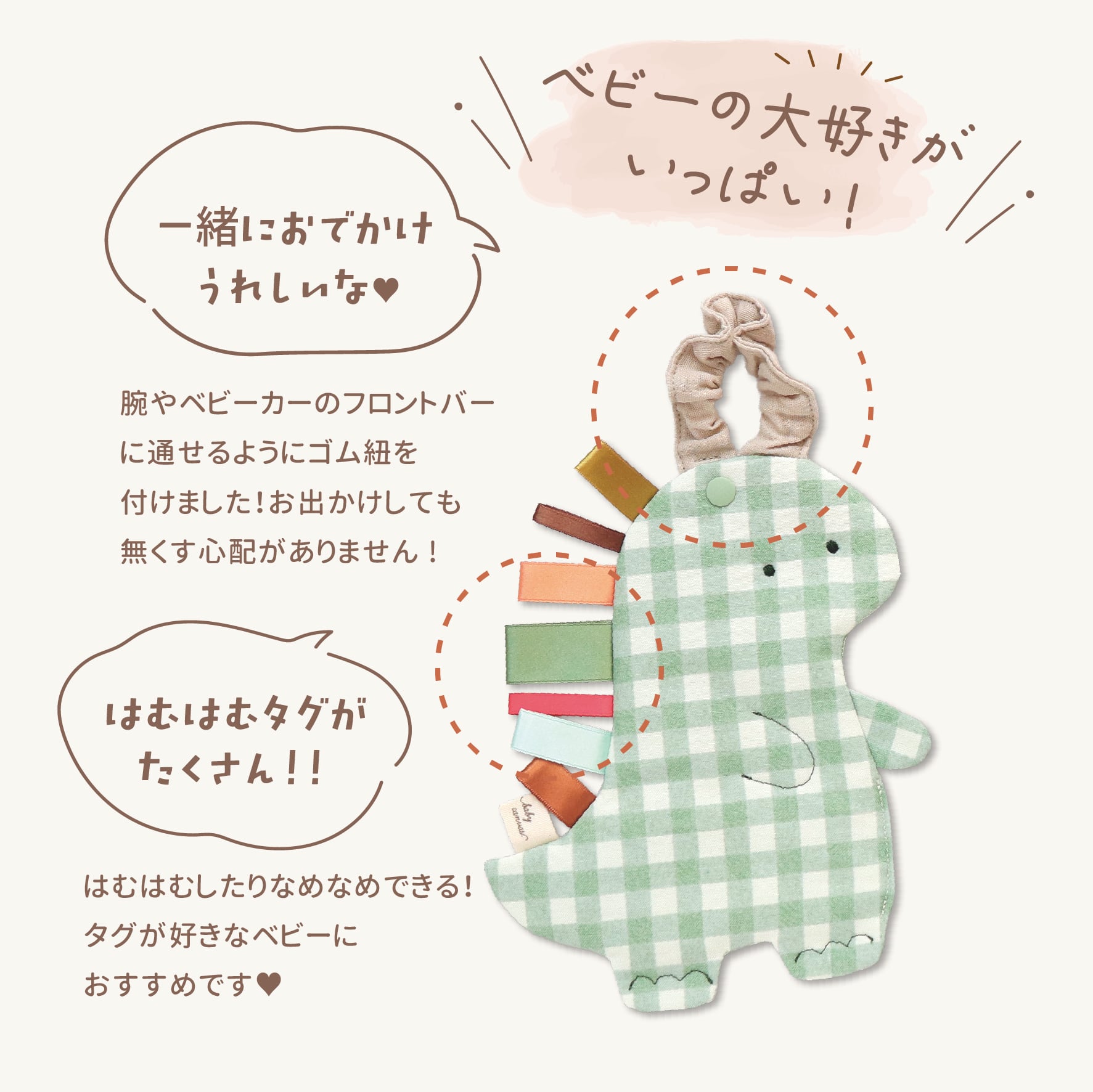 ●腕やベビーカーのフロントバーに通せるようにゴムを付けました!